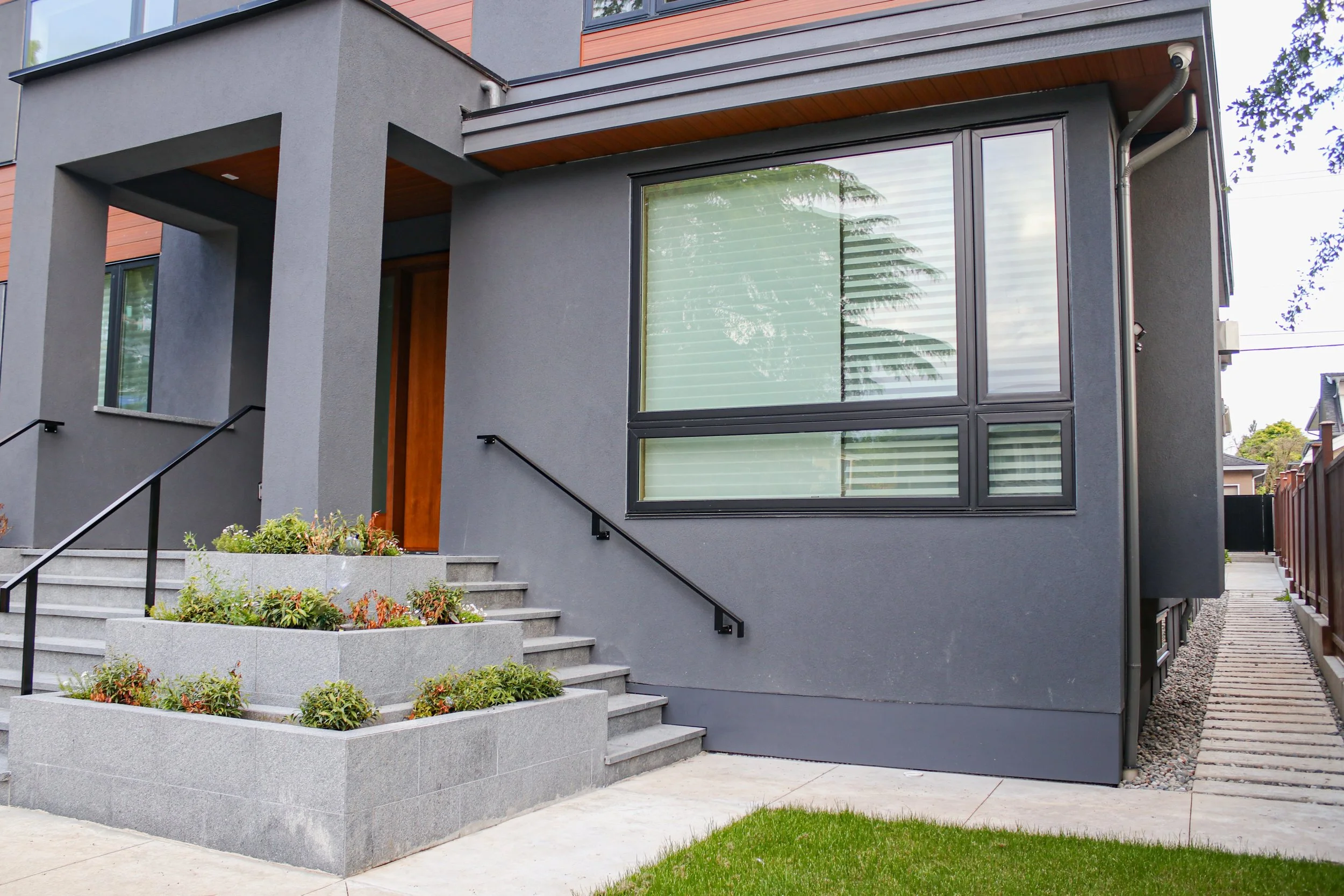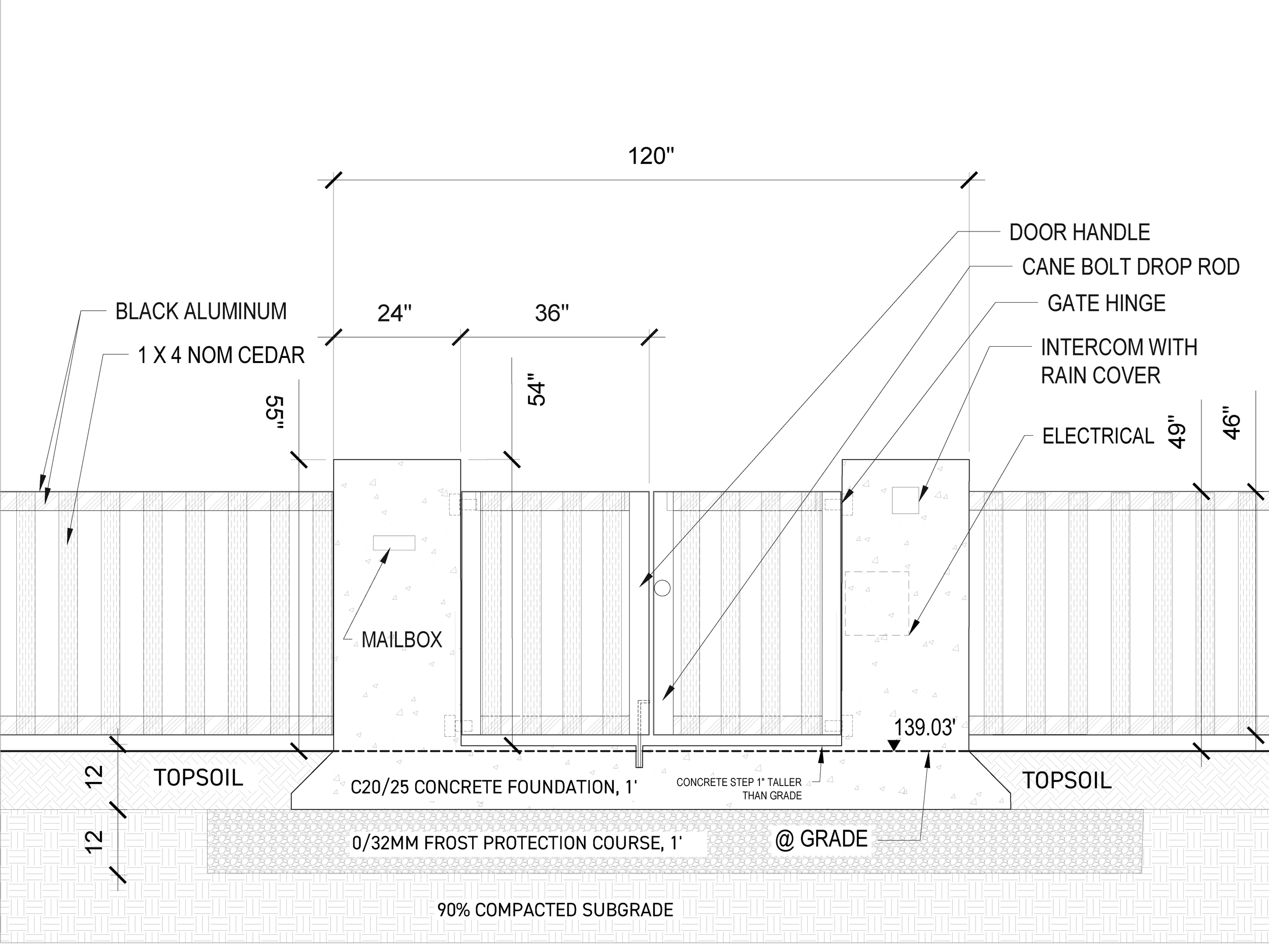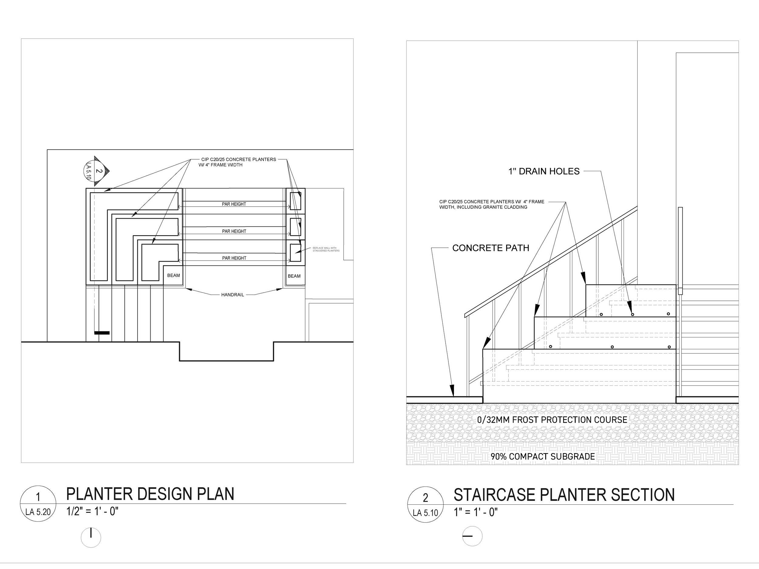 One design challenge was to fill an area of the front stairs. Due to the wrap-around stairs being installed, the railings requirements barred the corner of the stairs, creating an empty space adjacent to the pillar. A cascading planter in-between the railings was designed to fill the empty space and to soften the granite environment. Custom fencing and a fence post with a built-in mailbox was designed.